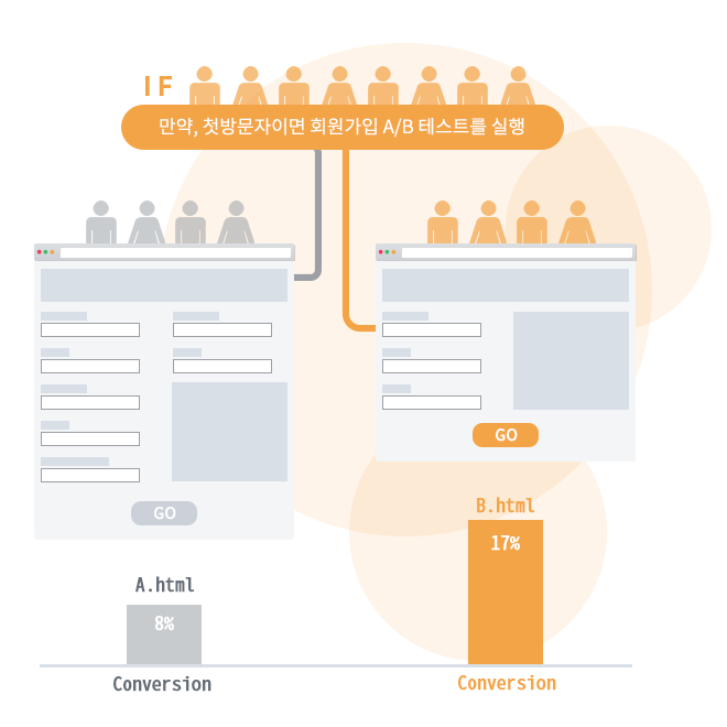 마케팅 가설을 설계 후 즉시 실행할 수 있으며, 결과 데이터 역시 실시간 확인할 수 있어 무척 편리합니다. 실시간 진행할 수 있는 온 사이트 마케팅 조건을 다양한 조합으로 만들기 쉽습니다