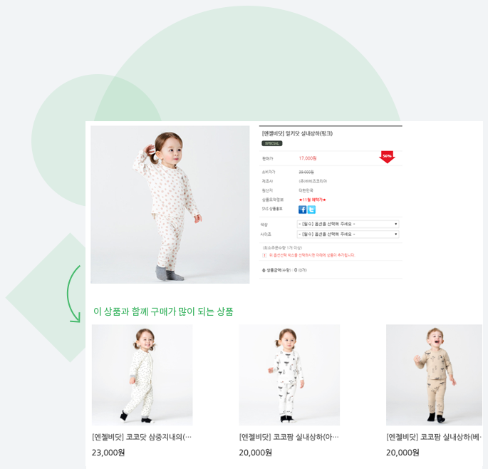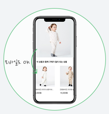 상품 상세 페이지에 몇 줄의 스크립트를 복사&붙여넣기 해서 빅 데이터 분석 기반의 연관 상품 추천 서비스를 이용할 수 있습니다.