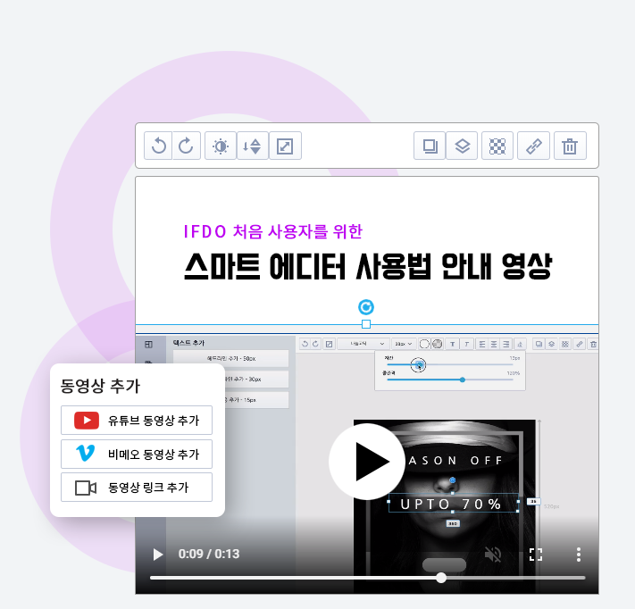 아이콘, 사진, 도형 및 폰트등 다양한 디자인 요소를 이용해서 쉽게 빠르게 디자인하세요